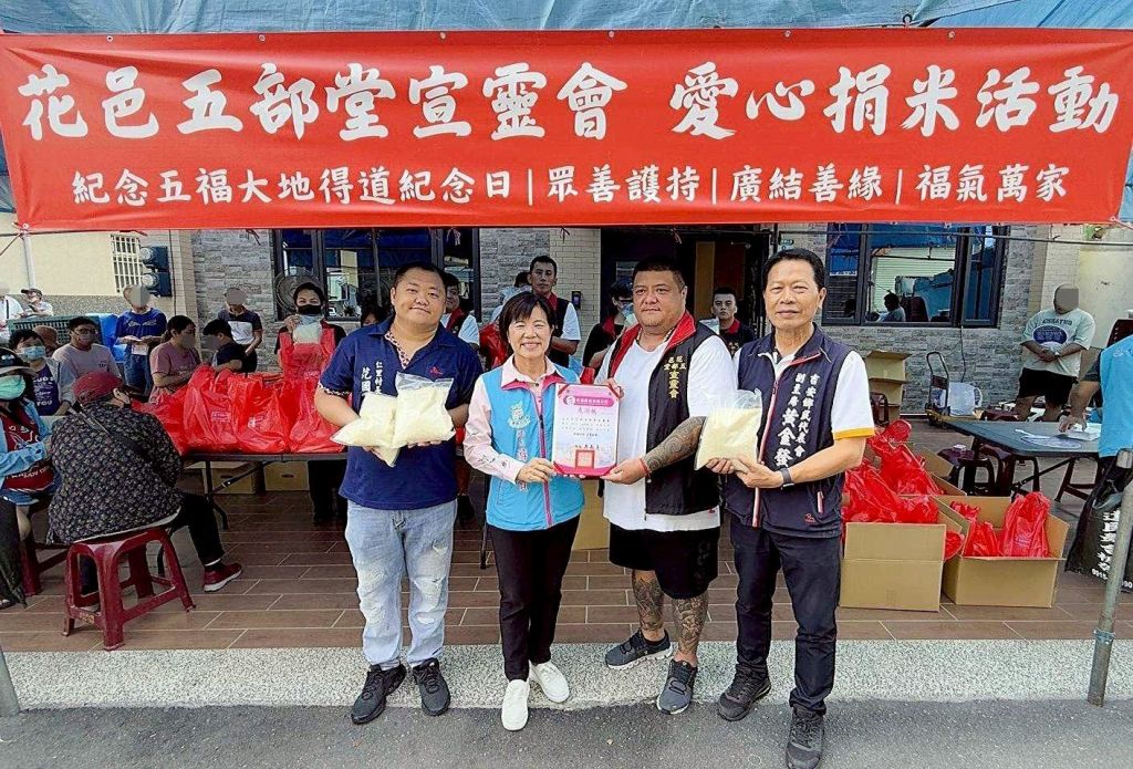 坐落於吉安鄉仁里村的花邑五部堂宣靈會,為傳遞主祀五福大地神恩與祝福,選擇在端午佳節也是主神得道升天之日,發放愛心米關懷貧困鄉親,堂主劉正堯也親領年輕幹部協助發放服務,幫行動不便的長者搬運物資上車。並感謝仁里村長范國昌,牽起社會資源與公部門之間的合作與關懷,期盼透過社會救助行動,進而帶動社會良善愛的循環。他表示,年輕人也許能做的並不多,但希望能力所拋磚引玉,讓更多弱勢村民感受到被支持的溫暖。