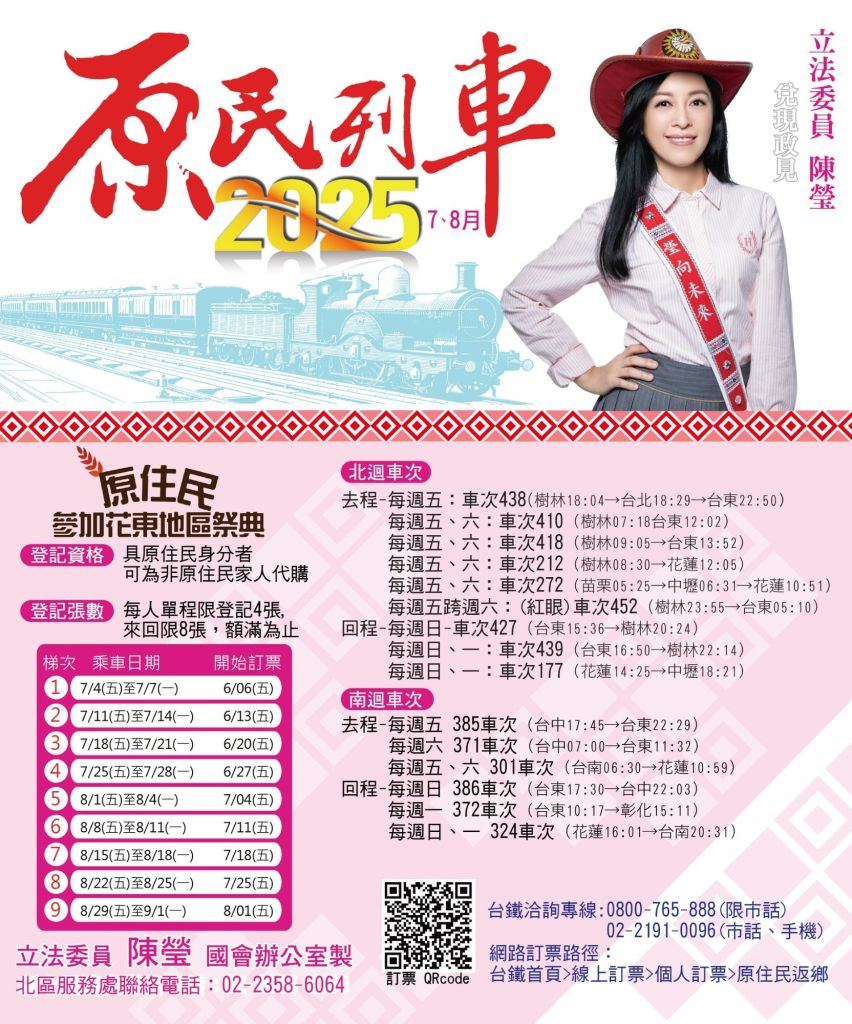 七、八月是花蓮台東的豐年祭,過去花東車票總是一票難求,想要回花東部落的族人,在搶不到車票的情況下,返鄉所搭的列車,必須「轉車再轉車」,才有辦法順利回到家。所以,立委陳瑩2016年重回立法院後,首推的重要政績,就是「原民列車」!至今已營運第10年。原民列車規劃初期,曾邀集原民會、交通部、審計部、主計總處及地方政府協商,終於在2016年開始試辦,同年將原本只有「北迴線」列車增加「南迴線」,後來從「試辦階段」進入「常態化」政策;2018年因應族人建議,增加「紅眼跨夜列車」;原本只有部分車站可供領票,原民列車自2019年併入台鐵訂票領票系統;2021年訂票、領票手續改為與台鐵訂票方式一致;2022年「EMU3000型城際列車」加入原民列車運輸。