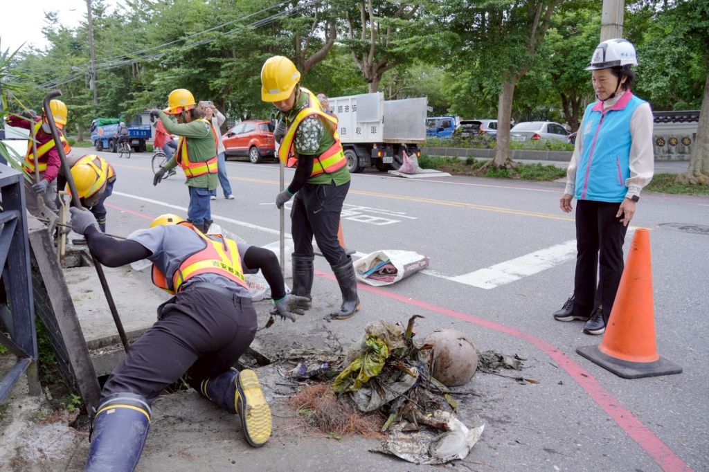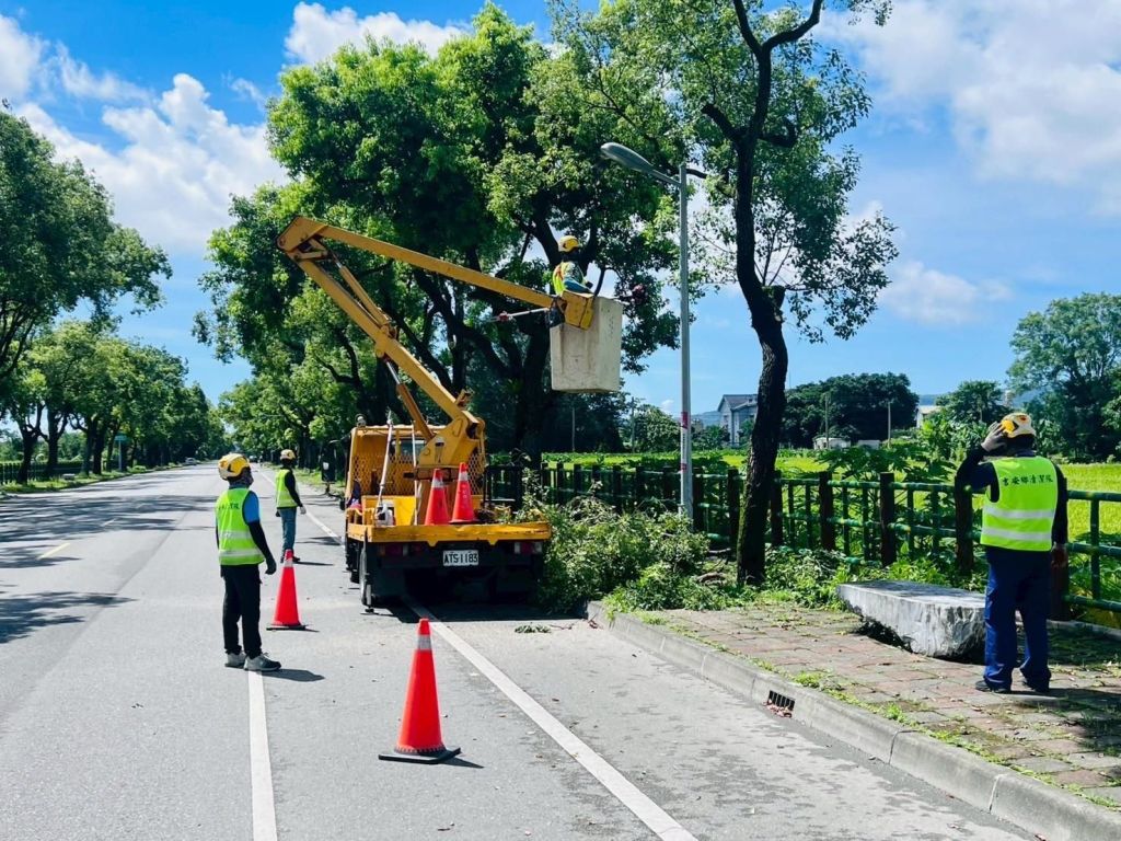吉安鄉清潔隊接獲鄉長游淑貞指令後,即陸續進行防颱減災工作,首站前往南華三街與華興五街交叉口、南海四街等地,針對道路兩側的排水溝進行清淤作業;因應風雨來襲前,清潔隊亦出動修樹班進行茂盛路樹整修,針對福昌路與吉安路交叉口附近路樹進行修剪,特別針對遮蔽路燈、纏繞電線或可能受強風影響的枝幹進行矮化與疏枝工作,以防路樹倒塌危及行人與居家安全。