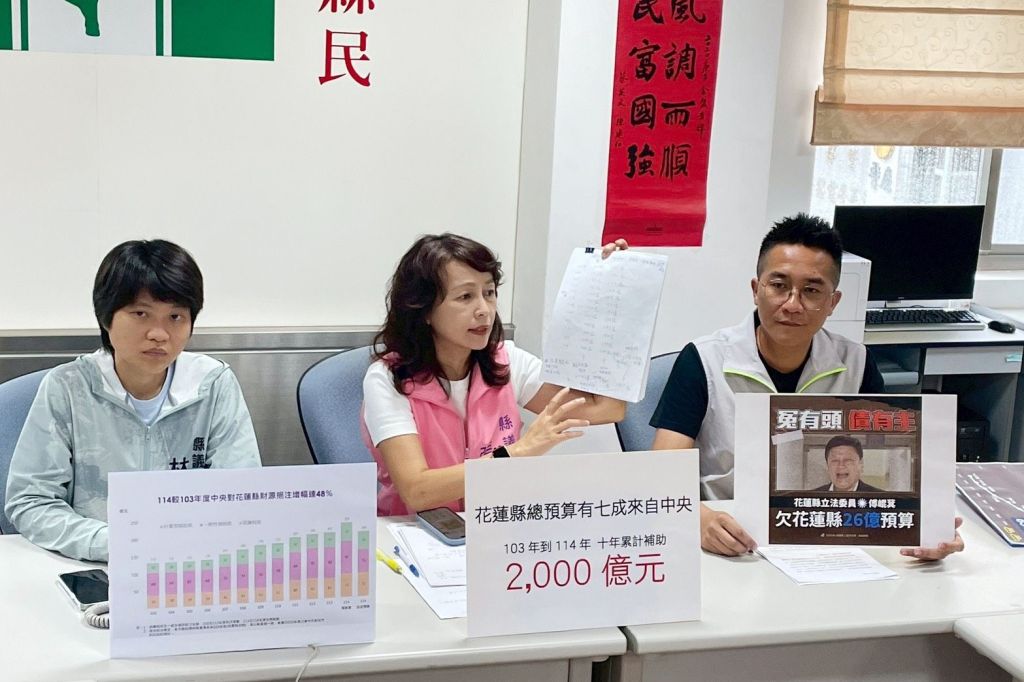 花蓮縣議會民進黨團今(12)日召開記者會,針對縣長徐榛蔚近日於議會所言「中央不照顧花蓮」,痛批傅崐萁、徐榛蔚連續擔任4屆縣長、長期把持縣府,花蓮縣政府這10多年來,歲入預算加總高達新台幣2700多億元,但預算使用浮濫甚至不明,且用人偏頗、弊案與司法案件叢生,花蓮不但看不到進步,甚至被鄰近的台東大幅超車,花蓮的孩子北漂或南漂的問題越來越嚴重,傅、徐就是花蓮最大的問題所在,卻還不讓議員發揮天職監督縣府,只會情勒議員。現在預算被刪減,源頭是傅崐萁在中央大砍預算、傷害財政紀律,導致地方受到影響,預算時程都被拖延,冤有頭債有主,罷免傅崐萁才是國家、地方雙贏的解方。