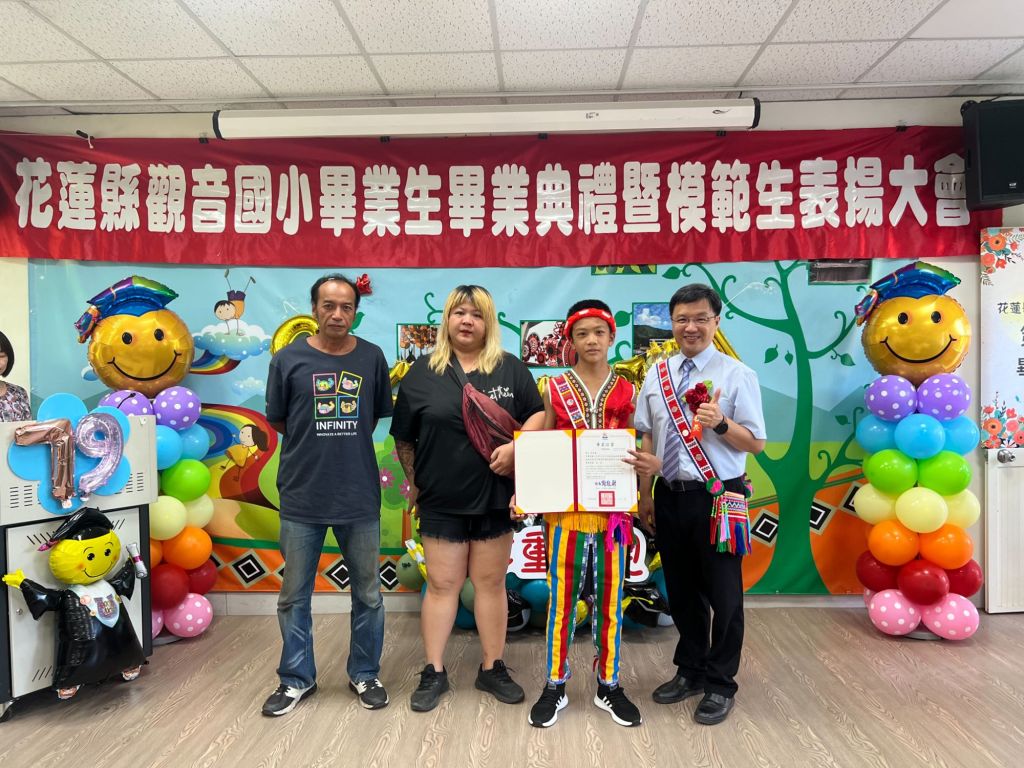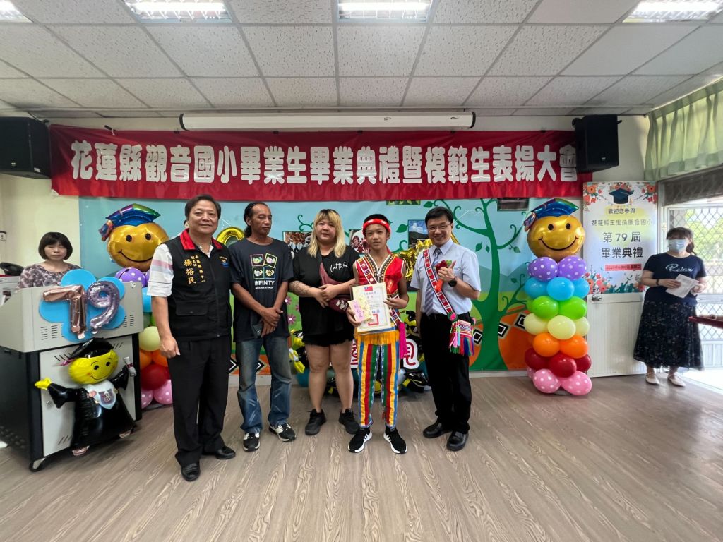 花蓮縣玉里鎮觀音國小今17日舉辦第79屆畢業典禮暨模範生表揚活動,典禮主角是一位唯一的畢業生,雖然人數精簡,卻讓整場活動更顯溫馨與感動。全校師生用音樂與舞蹈陪伴畢業生,留下最難忘的校園回憶。活動開場前,校長謝敬尉與導師陪同畢業生進行「校園巡禮」,一同踏上熟悉的校園角落,回顧過往六年的點點滴滴。無論是操場、教室,或是綠意盎然的樹下小道,都承載著孩子成長的足跡。