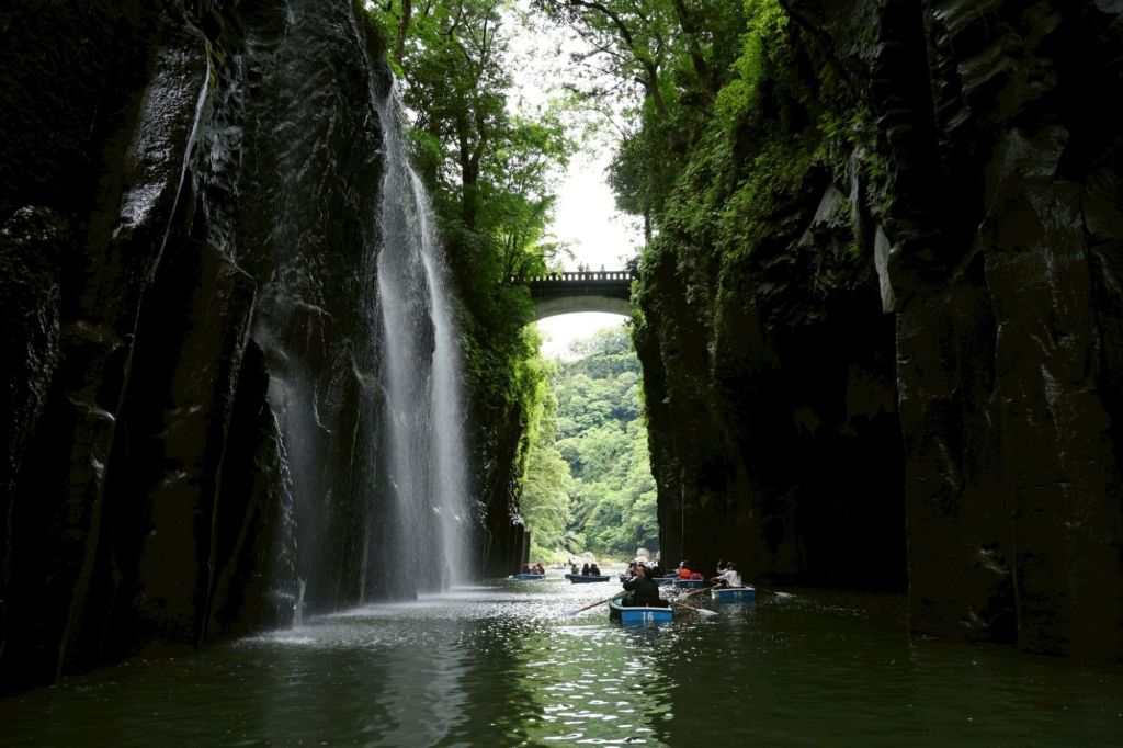 高千穗町以壯麗的地質景觀和豐富的神話文化聞名,當地最知名的高千穗峽,是由阿蘇火山熔岩經五瀨川長年沖刷而成,綿延七公里的峽谷地形搭配真名井瀑布,沿途步道設計完善,也能體驗在峽谷間划船,景色壯觀迷人。當地還有高千穗神社、天岩戶神社等與日本神話息息相關的宗教遺址,而夜間登場的神樂舞則將古老傳說與藝術演出巧妙融合,極具文化魅力。