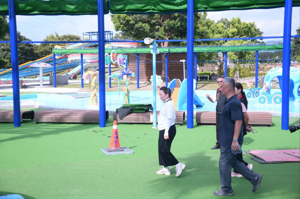 徐縣長今日現勘逐一檢視鋪面施工品質,環境造景美觀、氣墊式遊具之安全性,步道與草皮之舒適度及排水設施等。以及指示強化現場各場域安全性,避免孩子奔跑滑倒等風險,以及加強建置遮陽、遮雨的空間,提供鄉親安心舒適戲水環境。