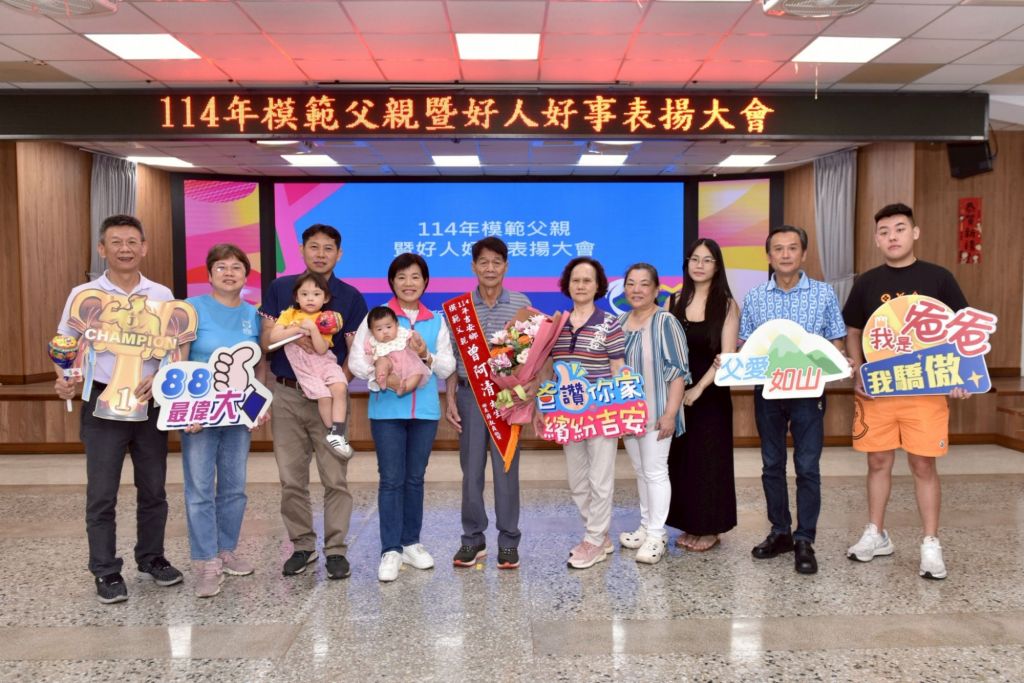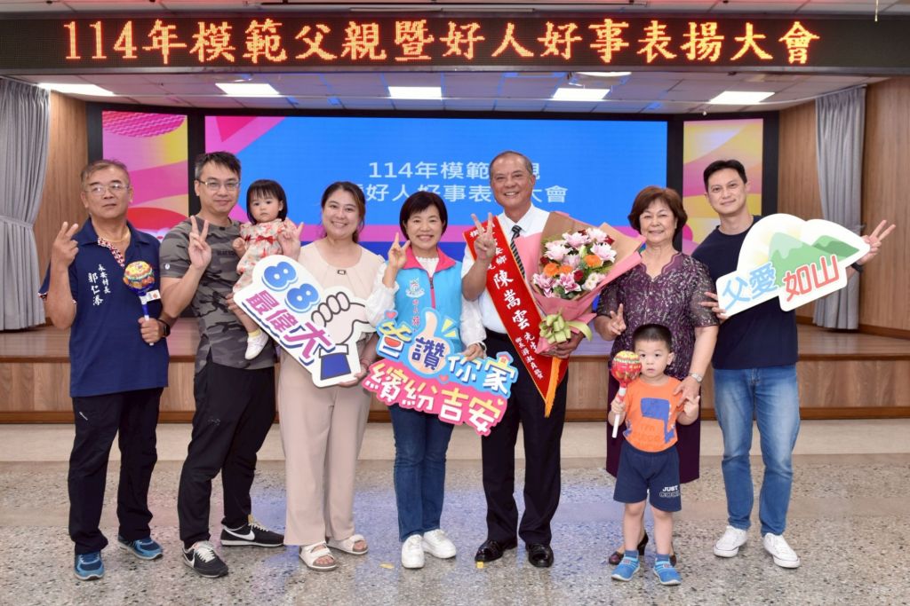 「我的爸爸是座山!」父親節將至,吉安鄉公所將於8月8日下午在福容大飯店舉辦「114年度模範父親及好人好事表揚大會」,表彰默默付出的爸爸們與行善典範。為定格這份榮耀與感動,鄉公所日前特別安排模範父親與好人好事代表共34位,於親民堂與鄉長、村長及家人合影留念,記錄下難得的溫馨時光。鄉長游淑貞發揮創意,親手致贈每位爸爸一根象徵父愛如山、甜蜜無窮的「巨型棒棒糖」,期盼他們將幸福分享給家人,也誠摯邀請親友共襄盛舉,向這些如大樹般守護家庭的父親們致敬。