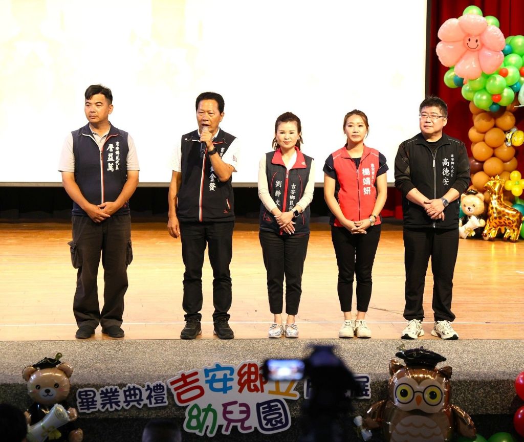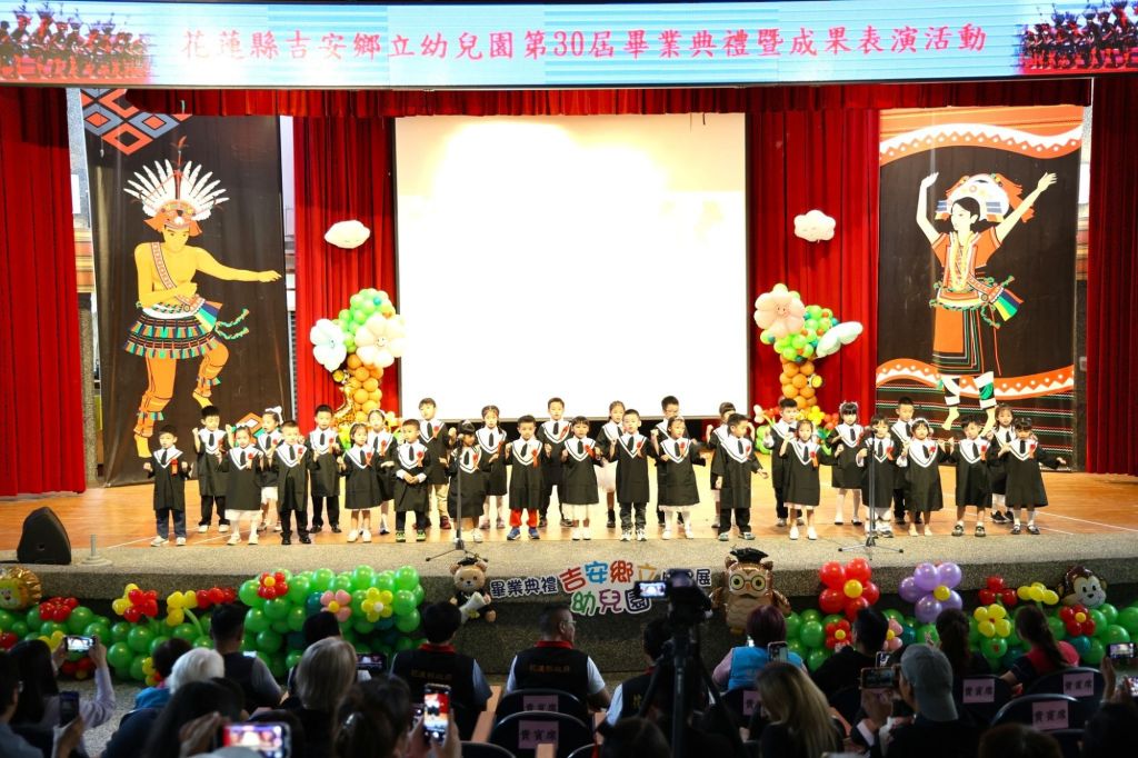 吉安鄉立幼兒園日前在阿美文化館舉辦第30屆畢業典禮,為今年30位畢業生精心安排精彩展演活動,小寶貝們以國、客語致畢業感恩詞,搭配原住民舞蹈、舞台劇及合唱等多元才藝串聯,展現豐富的學習成果,贏得全場來賓與家長們掌聲不斷。「鄉長媽咪」游淑貞感動表示,賀喜小小畢業生完成人生中第一個學習階段,也欣慰孩子們展現多元藝能學習成果,留下完美回憶,誠摯祝福每個小寶貝皆能勇敢迎接挑戰,開創屬於自己的璀璨未來。