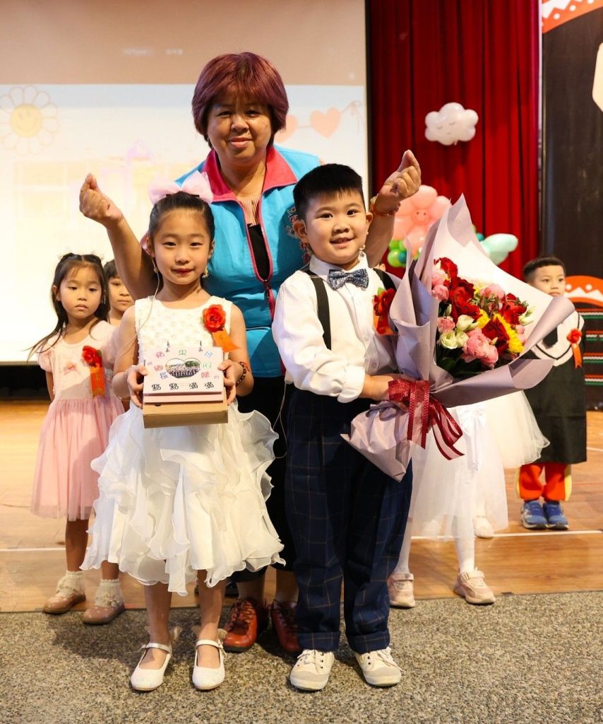 家長「栗岑媽媽」在女兒陪伴下上台激動分享,為孩子的成長感到驕傲,謝謝老師們把女兒教導成為貼心的小女孩…;「詠萱媽媽」也感謝鄉幼大家庭的呵護,孩子轉眼成長為懂事的小小酷哥辣妹,相信寶貝們都能勇敢面對未來挑戰。溫馨時刻不間斷!師生們準備了收錄「鄉長媽咪」陪孩子們參與活動的相簿,也留有畢業生簽名和花束,送給鄉長,藉由這份滿載回憶的禮物表達心意。