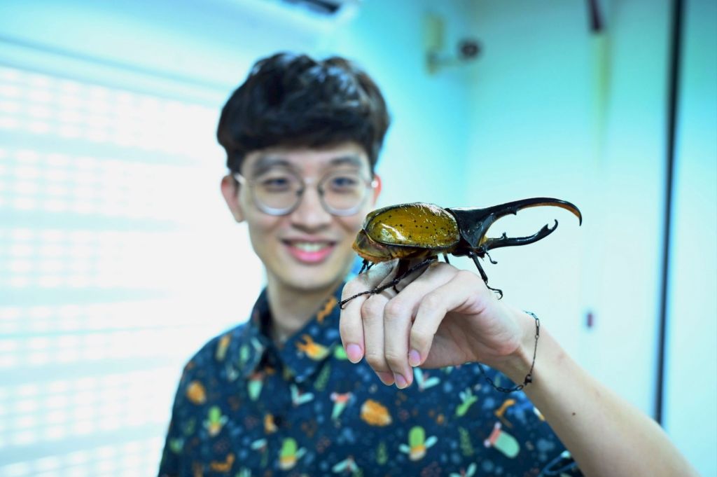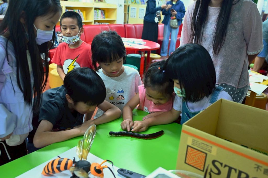 在課程體驗環節,孩子們興奮地輪流將巨人馬陸輕輕放在手臂上,感受牠緩慢爬行的觸感,也仔細觀察長戟大兜蟲展現威風的角鬥姿態。皮特老師也示範如何分辨不同昆蟲的特徵與生活習性。孩子們紛紛提問,現場笑聲與驚呼聲此起彼落,氣氛十分熱絡,不少家長也跟著參與其中,共同感受自然生態的奇妙與樂趣。