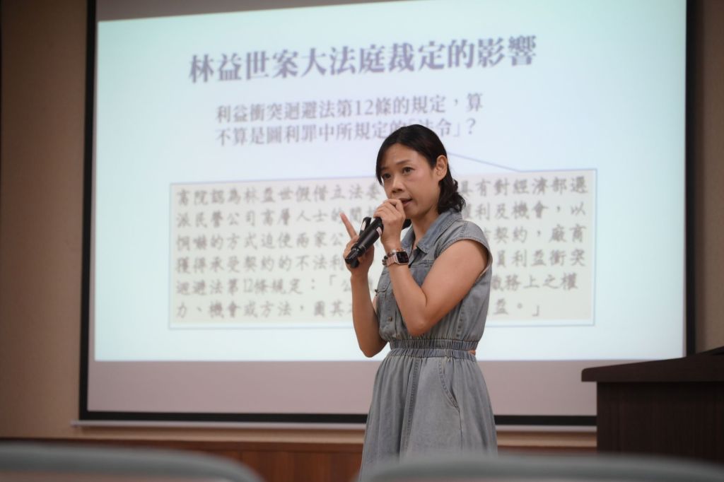 《公職人員利益衝突迴避法》與《公職人員財產申報法》等陽光法案,有助於社會大眾監督政府施政,更是機關強化廉能自律的依據。萬曉芳專員藉由實務案例說明,「利益」不僅限於金錢,如都市規劃所致不動產增值、違章建築緩拆認定,以及人事任用相關措施,亦屬利衝法所稱之「利益」。她也提醒同仁,執行小額採購及補助等常見業務時,務必注意利衝法迴避原則,並依該法第14條第2項規定,落實機關主動公開身分關係的義務。