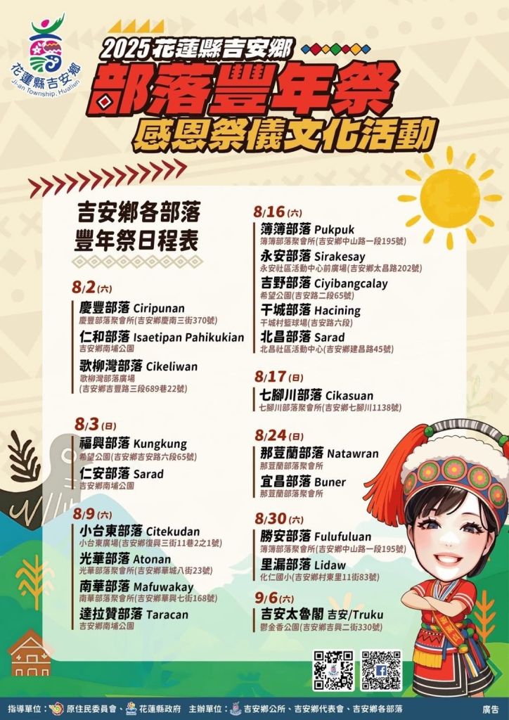 吉安鄉114年度豐年祭將自8月2日至9月6日接力展開,活動多集中於六、日舉行,壓軸為9月6日太魯閣族感恩祭,屆時將安排豐富技藝競賽與文化展演,歡迎鄉親與遊客共同參與,相關資訊可透過智慧門牌上的QR code進入公所官網或上臉書粉絲專頁查詢。
