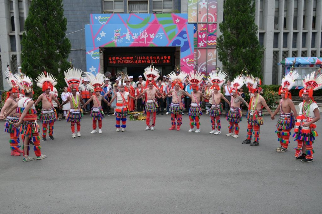游淑貞鄉長偕部落十九位頭目及一位長老,在議員李正文、周駿宥、笛布斯‧顗賚,吉安鄉代會副主席黃金發及代表林志忠、余震華、詹益萬、宜昌村長黃志源等貴賓陪同下,於鄉公所前廣場隆重迎接部落青年籌辦的傳統報訊息儀式。青年們踏著整齊步伐、手持信物依儀式完成報訊,鄉長接下信物並回贈米酒表達祝福,祈願各部落豐收平安,勇士們續傳承部落精神與文化責任。
