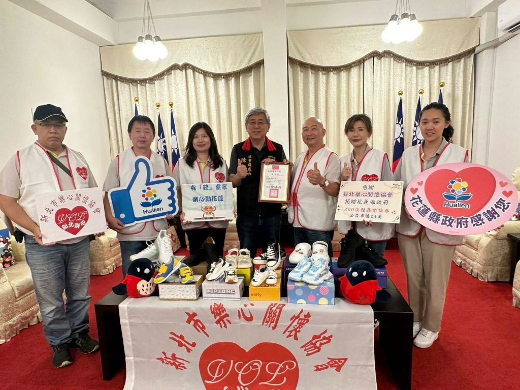 花蓮縣政府今(11)日於縣府貴賓室舉辦「新北市樂心關懷協會鞋券捐贈儀式」,由協會理事長黃世和率領團隊捐贈300張鞋品兌換券給花蓮縣弱勢兒少家庭,每張面額800元,總計市值新臺幣24萬元,提供孩童自由選擇鞋款的機會,讓愛心實質落實於生活所需,協助減輕家庭負擔。