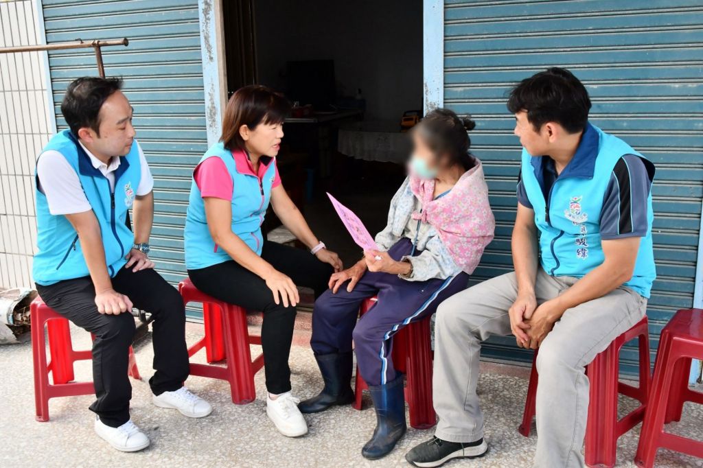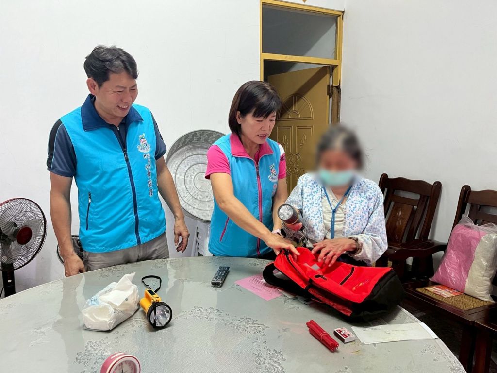公所團隊隨後到訪獨居長者處所,游鄉長不放心的一再叮囑長輩要注意安全,並幫忙貼上公所特別貼心準備的簡易電話聯絡資訊表,仔細地叮嚀保全戶與獨居長者,需協助時要趕快撥打電話求助。獨居的黃嬤嬤看到大家的關心,即刻拿出防災避難包和已經準備好的各式樣手電筒,笑容滿面地秀出法寶,告訴大家她的子女雖都在外地工作,特安裝即時監測系統隨時關注其安全,請大家安心。