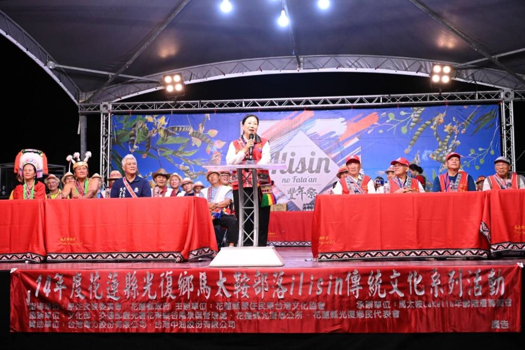 花蓮縣光復鄉Fata’an部落8月14日至16日,在Fata’an祭祀廣場舉行盛大的豐年祭(Ilisin)盛典,縣長徐榛蔚昨(14)日在原住民行政處長馬呈豪陪同下出席致意,與部落族人在傳統祭儀中,歡慶一年一度的豐收盛事。她感謝祖靈恩惠,再次帶來豐收的一年,更祝福部落文化薪火相傳、傳統文化發揚光大。
