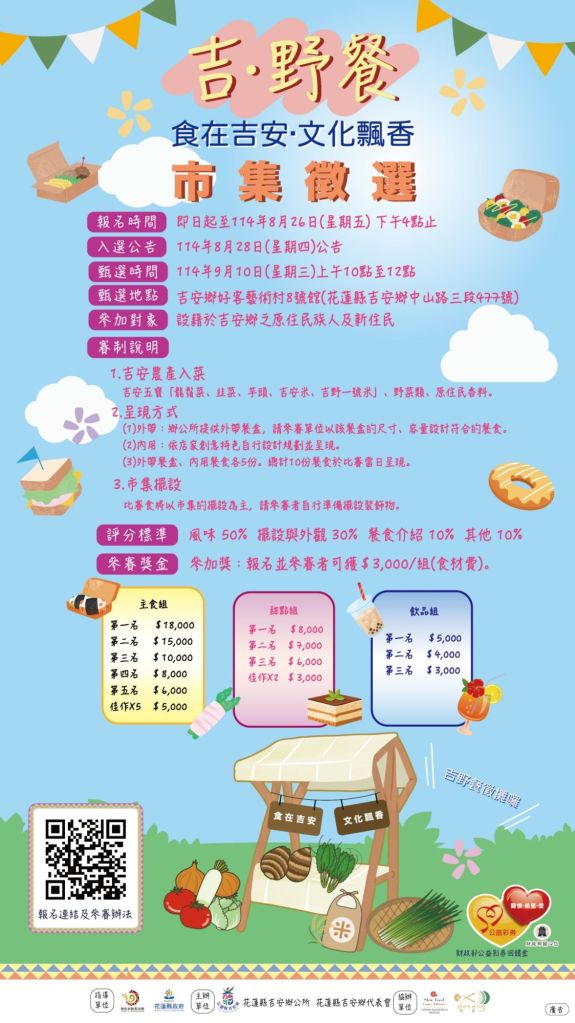 鄉公所提醒有意參加者,通過甄選入選後需負相關權利義務,包括凡獲選前15名需參加本所安排之攤位訓練課程,結訓後獲獎勵金400元擺攤布置費,於下半年參與鄉境及周邊市集至少9場次…等,歡迎有興趣的廚藝好手屆時踴躍報名甄選,共同打造吉安鄉的美食文化地圖,讓更多人認識部落、欣賞原民文化魅力。
