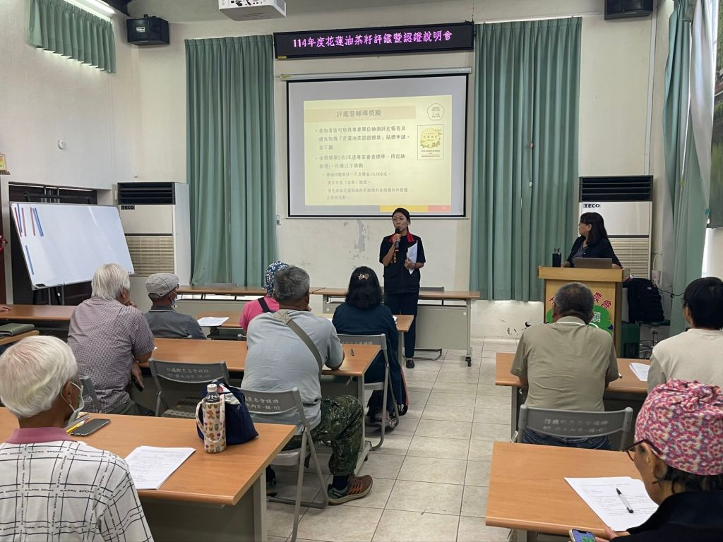花蓮縣政府輔導玉溪地區農會辦理114年度花蓮油茶籽評鑑活動,於8月18日在玉溪地區農會推廣中心召開評鑑活動說明會,凡取得有機或產銷履歷驗證的縣內油茶農友,皆可報名參與,經評鑑榮獲金獎者,將頒發獎金、獎狀並輔導取得花蓮縣政府「花蓮油茶證明標章」,象徵著卓越品質與源自花蓮的獨特風味。