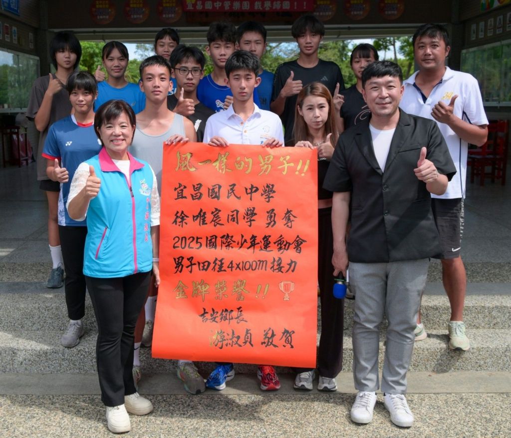 游淑貞特別以「鄉長阿姨」的身分親赴宜昌國中貼紅榜,並頒贈藍芽喇叭及麥當勞餐券給「飛毛腿」小將;現場田徑隊員也一同獲得餐券鼓勵。她勉勵學生持續精進,勇敢挑戰國際賽事,同時感謝學校校長與教師的辛勤付出,以及家長的陪伴支持,強調鄉公所將永遠是孩子們最堅強的後盾。