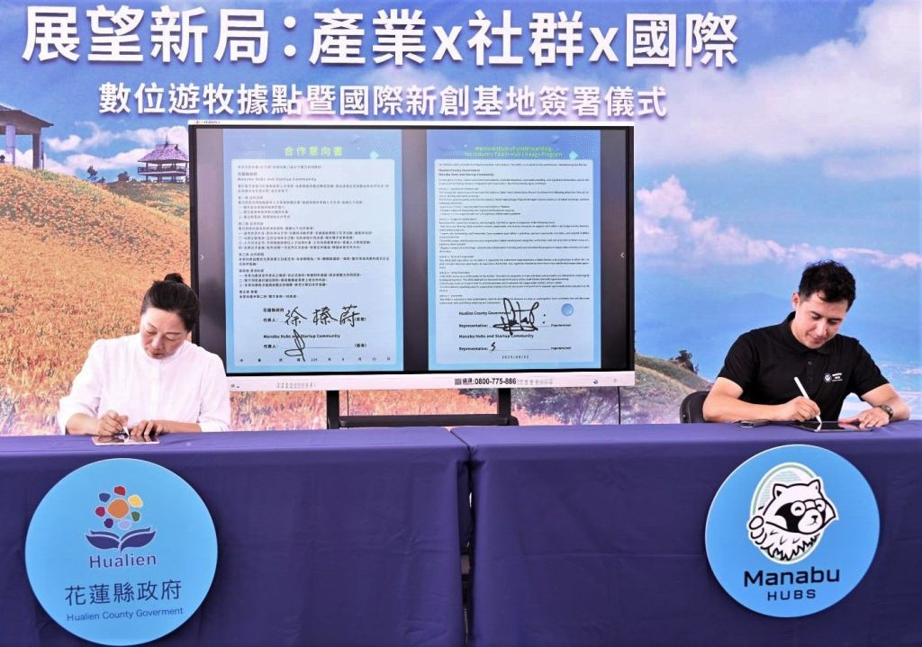 縣長徐榛蔚任內積極推動創新創業政策,逐年擴大相關措施,今(21)日於花蓮雲基地舉行「數位遊牧據點×國際新創社群簽署儀式」,由縣長徐榛蔚與日本福岡最大海外社群Manabu Community創辦人Pablo Riveros簽署合作意向書,串聯國際新創能量,打造資源共享、人才交流的創新生態。同時,今日也頒發「數位遊牧友善標章」給首批申請審核通過的15家旅宿業者。