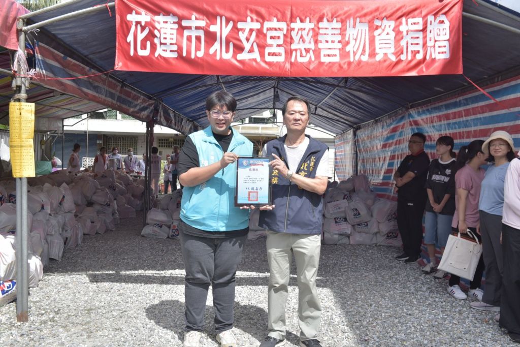 花蓮市北玄宮今(31)日捐贈300份普渡物資給花蓮市實物銀行,市長魏嘉彥前往頒發感謝狀,感謝北玄宮發揚北極玄天上帝慈悲救世、濟弱扶貧的精神,以信眾大德的善舉,連續15年將普渡物資透過花蓮市公所社福平台幫助弱勢族群,這批物資將會存入實物銀行,提供給面臨困境的民眾申領。