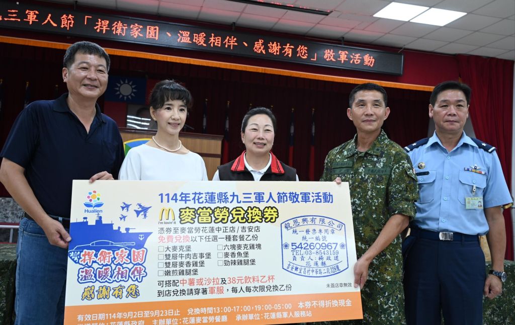 為慶祝九三軍人節「捍衛家園、溫馨相伴、感謝有您」敬軍活動,由花蓮縣政府偕同花蓮縣軍人服務站今(2)日於花東防衛指揮部舉辦,縣長徐榛蔚在民政處副處長吳俊毅陪同下出席慰問,並代表致贈麥當勞餐券給近萬名駐守花蓮縣三軍部隊的官兵,感謝國軍保家衛國辛勞。