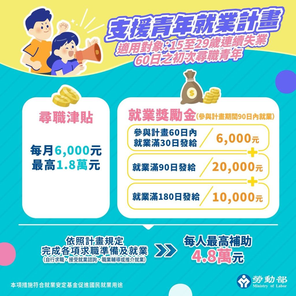為因應國際情勢,勞動部於9月1日推動「支援青年就業計畫」,為15至29歲初次尋職青年提供全方位支持。計畫旨協助初次尋職青年強化求職準備,並支持青年積極尋職及穩定就業,最高補助達新臺幣4萬8,000元,幫助青年順利踏入職場。該計畫為「初次尋職青年穩定就業計畫」的強化版,將失業門檻從90日放寬至60日,讓政府資源及早介入,避免初入職場青年因國際經貿因素而導致成為長期失業者,同時提升就業意願。