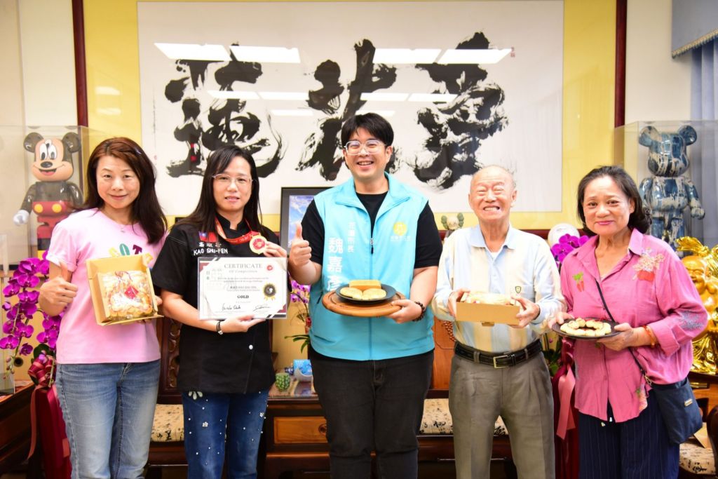 花蓮霖源興創意藝術糕餅業者高淑芬,8月底遠赴日本沖繩參加「2025日本國際亞洲餐飲挑戰賽」(JIAFBC),以改良創新的繼光平安餅勇奪「觀光伴手禮金牌」殊榮,為台灣爭光。返國後,高淑芬特別偕同雙親及鼓勵她參賽的黃湘涵老師,拜會花蓮市長魏嘉彥,分享這份榮耀與喜悅。