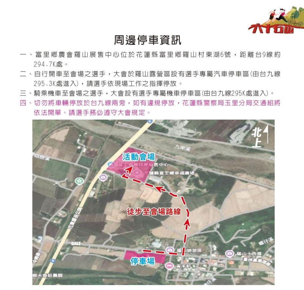 停車資訊如下,一、主會場:富里鄉農會羅山展售中心位於花蓮縣富里鄉羅山村東湖6號,距離台9線約294.7K處。二、自行開車至會場之選手,大會於羅山露營區設有選手專屬汽車停車區(由台9線295.3K處進入),請選手依現場工作人員指揮停放。三、騎乘機車至會場之選手,大會設有選手專屬機車停車區(由台9線295K處進入)車位若停滿則停至汽車停車區。四、切勿將車輛停放於台9線兩旁,如有違規停放,花蓮縣警察局玉里分局交通組將依法開單,請選手務必遵守大會規定。