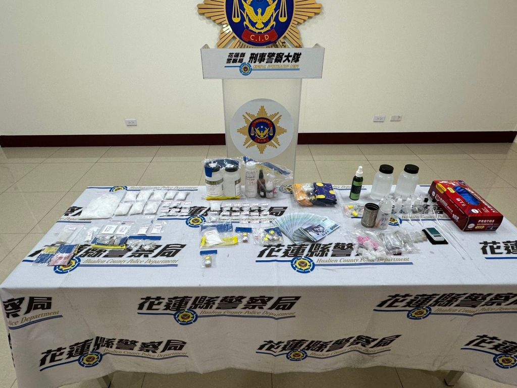 花蓮縣警察局刑事警察大隊在臺灣花蓮地方檢察署檢察官指揮下,日前持臺灣花蓮地方法院核發之搜索票,於花蓮市兩處地點同步展開緝毒行動,成功查扣一級毒品海洛因6包(毛重19.77公克)、二級毒品安非他命30包(毛重478.59公克)、依托咪酯原料1包(毛重20.11公克)、依托咪酯菸油8罐(毛重1143.08公克)、喪屍菸彈及毒咖啡包等多種毒品,以及相關分裝器具、行動電話與現金新臺幣8萬1,000元,展現警方掃蕩毒害的決心與行動力。