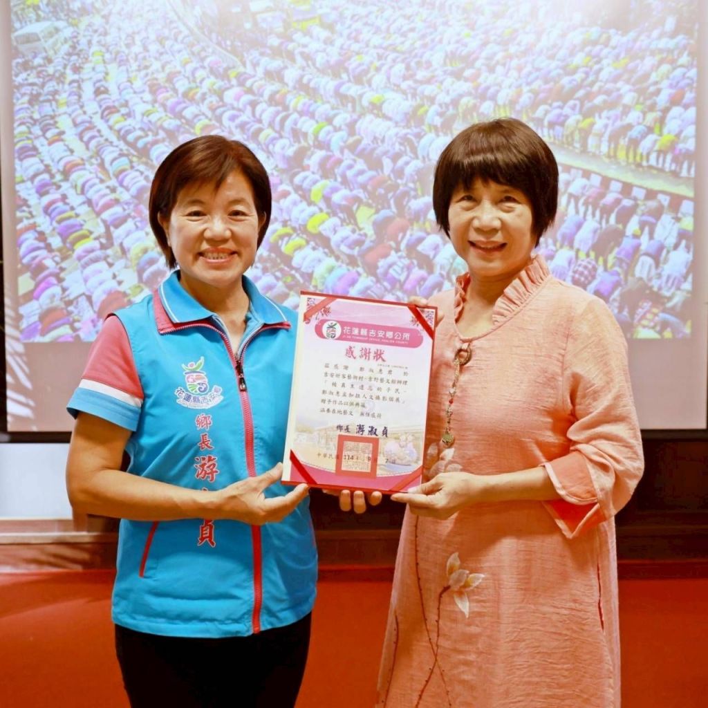 展覽中,鄭淑惠捐贈作品予吉安鄉公所典藏,並帶領與會群眾逐一導覽。無論是作品呈現朝拜人潮的壯闊景象、旅客爬上火車頂返鄉的震撼畫面、或漁民補破網的專注神情,以及孩童以「月亮船」為玩具,都令觀者駐足良久,彷彿身歷其境。