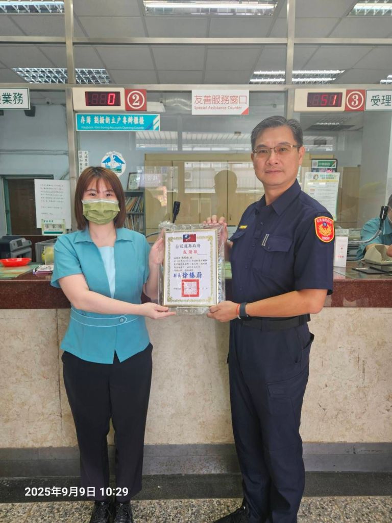 為守護民眾財產安全,花蓮縣警察局鳳林分局與瑞穗郵局攜手合作,於114年6、7月間成功攔阻多起詐騙案件,合計保住民眾新臺幣200萬元財產。鳳林分局長劉玉祥特於近日率領偵查隊長吳泓修及偵查隊同仁,親赴瑞穗郵局頒發感謝狀,表彰郵局行員的機警與熱心,展現警民聯防的卓越成效。