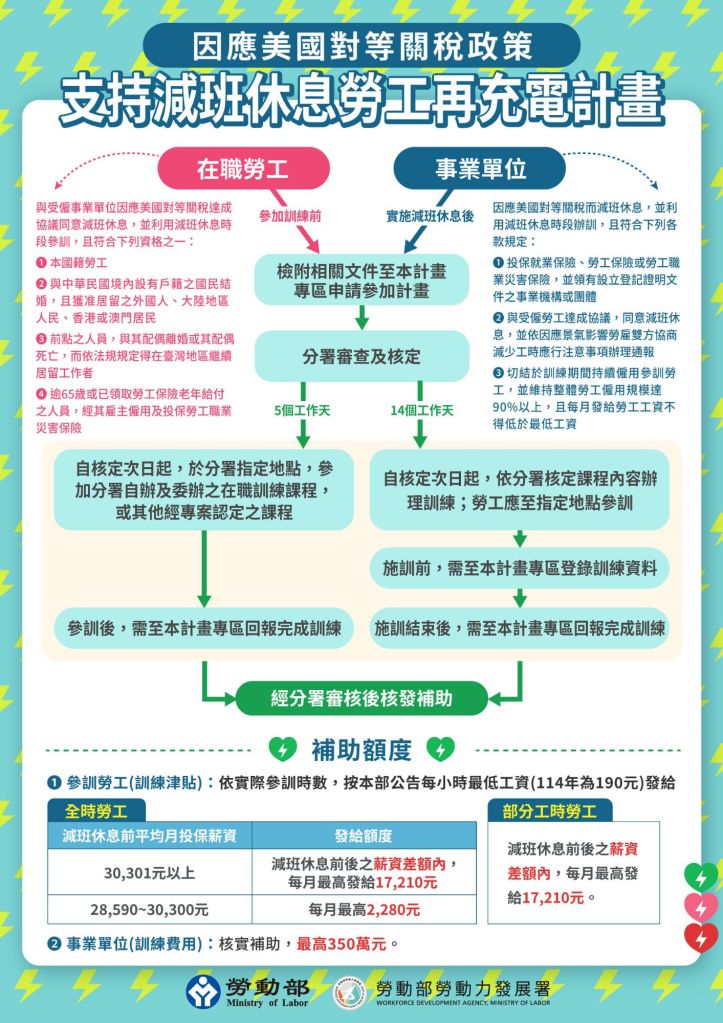 若減班休息勞工符合勞動部「擴大僱用安定措施」適用對象 (食品及飼品製造業、紡織業、橡膠製品製造業、塑膠製品製造業、金屬製品製造業、電力設備及配備製造業、機械設備製造業、汽車及其零件製造業及其他運輸工具及其零件製造業等9行業)者,可申請減班休息前後薪資差額70%之補貼,每人每月最高可領12,100元,最長發給6個月,受理期限至115年1月31日止。