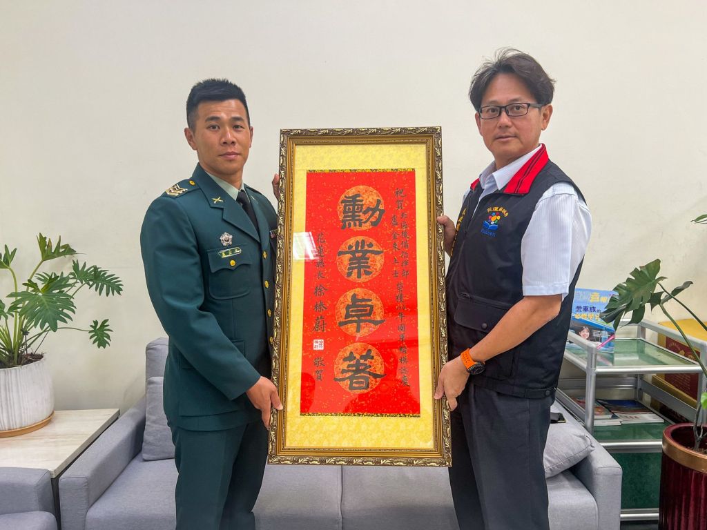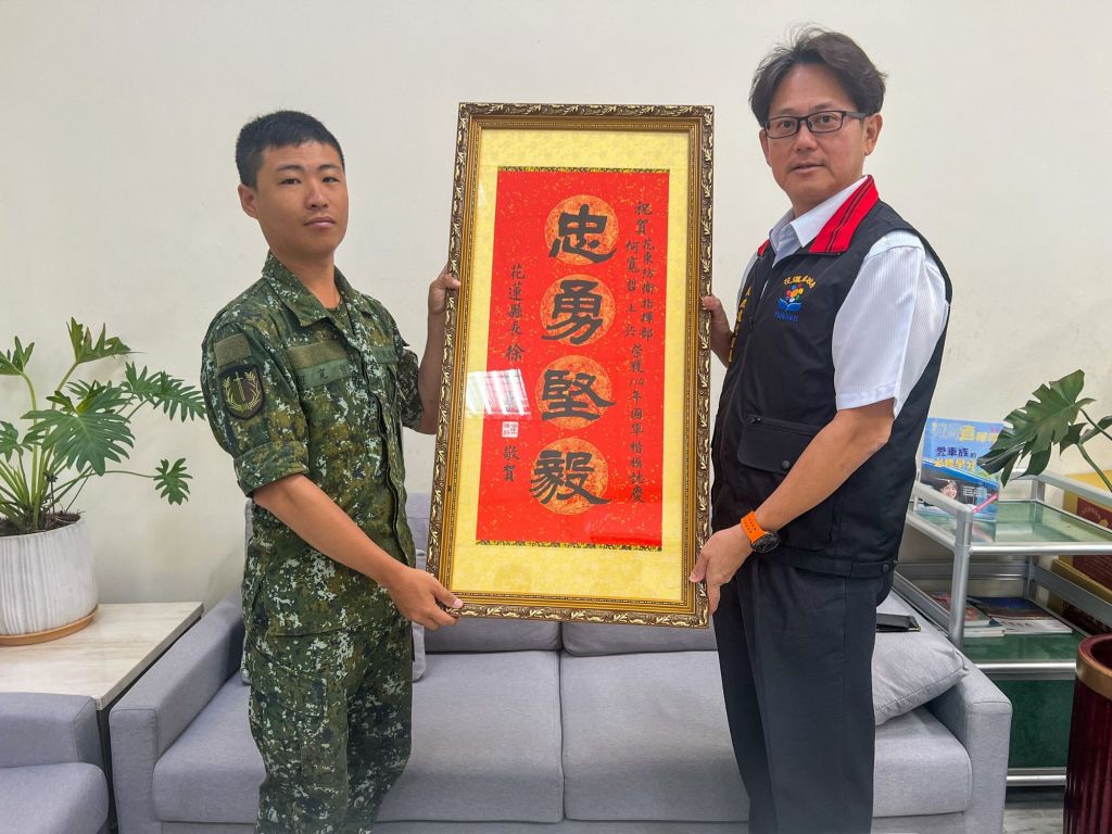 縣府今(19)日由民政處代理處長李葳代表徐榛蔚縣長,致贈中堂賀匾,轉達縣府及全體縣民對兩位楷模的敬意與祝福,並象徵地方社會對國軍官兵的高度肯定與支持。