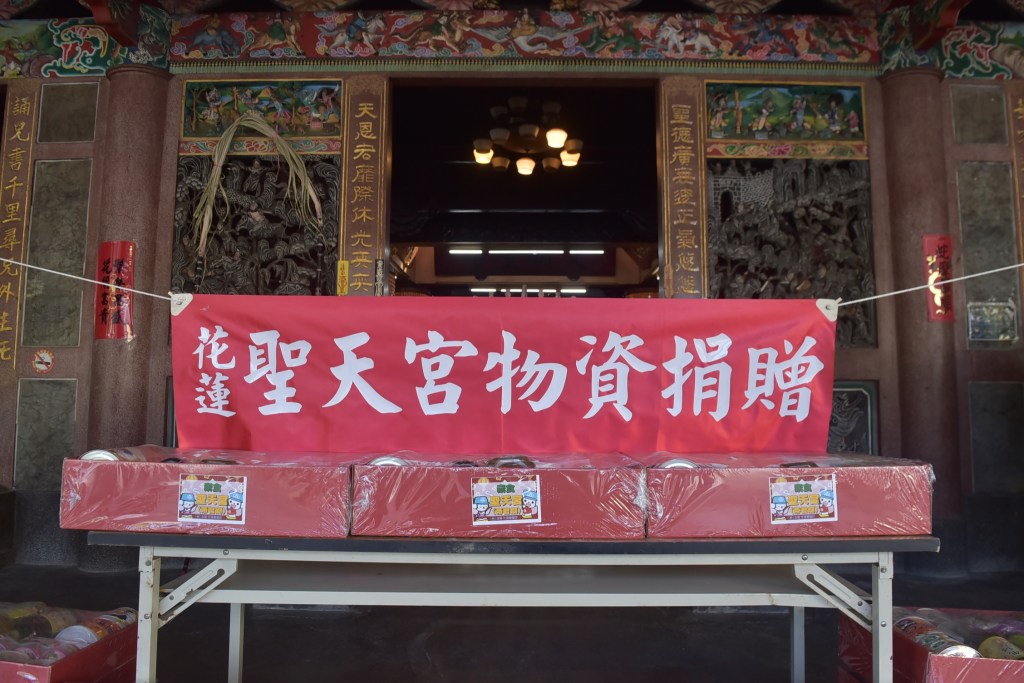 這次聖天宮普渡物資的受贈單位分別為花蓮市公所實物銀行、國防、國盛、國聯、國光、國魂、國風、國魂、國威、國安、國治、民政里,花蓮縣普愛協會、財團法人人安基金會、華山基金會(花蓮站、瑞穗站)等團體,以及贈出2份物資給九寶爸一家