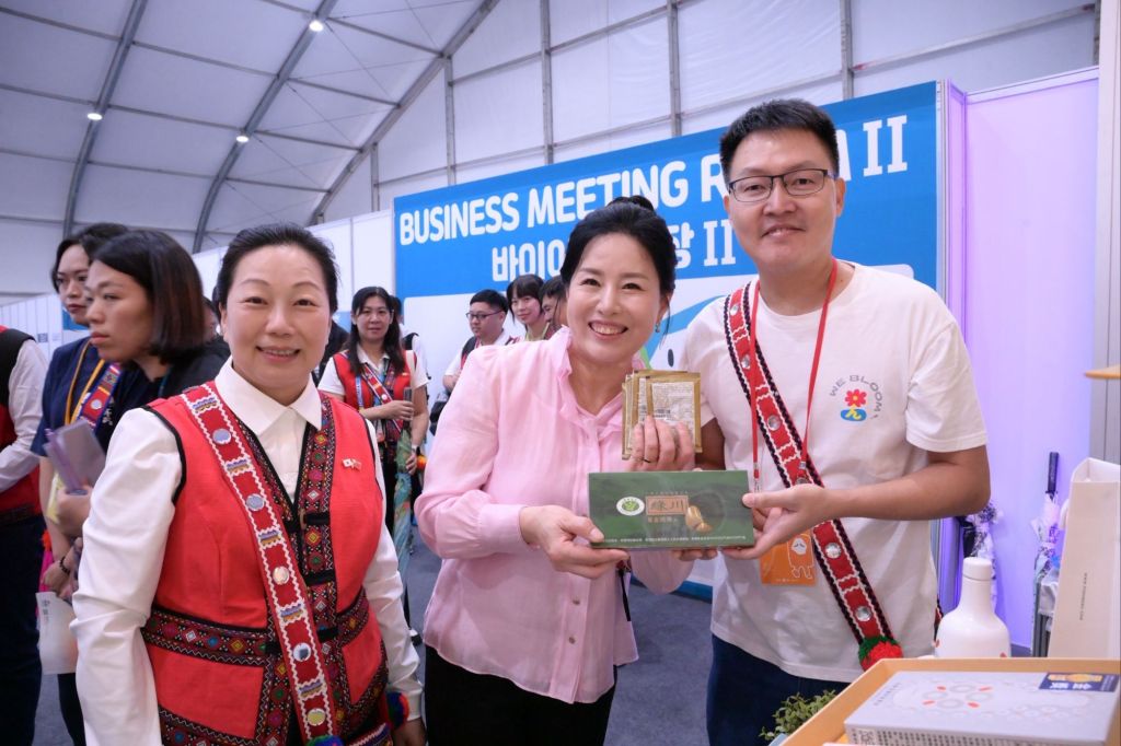 2025年堤川國際韓方天然物產業世博會今(20)日登場,花蓮縣獲邀參展,縣長徐榛蔚率團及縣內13家優質企業,前往韓國忠清北道堤川市共同推廣花蓮優質農特產,縣長徐榛蔚更特別親自為堤川市長夫人逐一介紹每項產品,向國際友人展示花蓮的農特產與文化魅力。