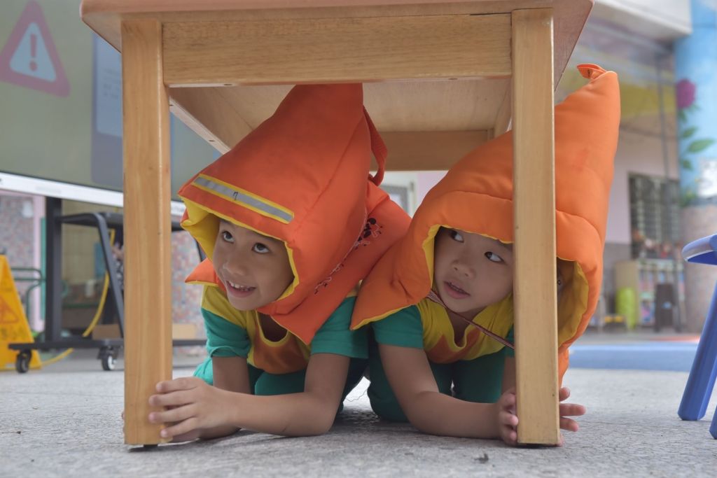 台灣地震活動頻繁,為讓孩子們面對災害不慌張及正確的避難觀念,花蓮市立幼兒園今天舉辦「國家防災日」避難疏散演練。演習警鈴響起,小朋友們都依老師的指示戴上防震帽後躲進桌底並抓穩桌腳,老師也提醒他們,地震搖晃期間要留在原地直到停止搖晃為止。