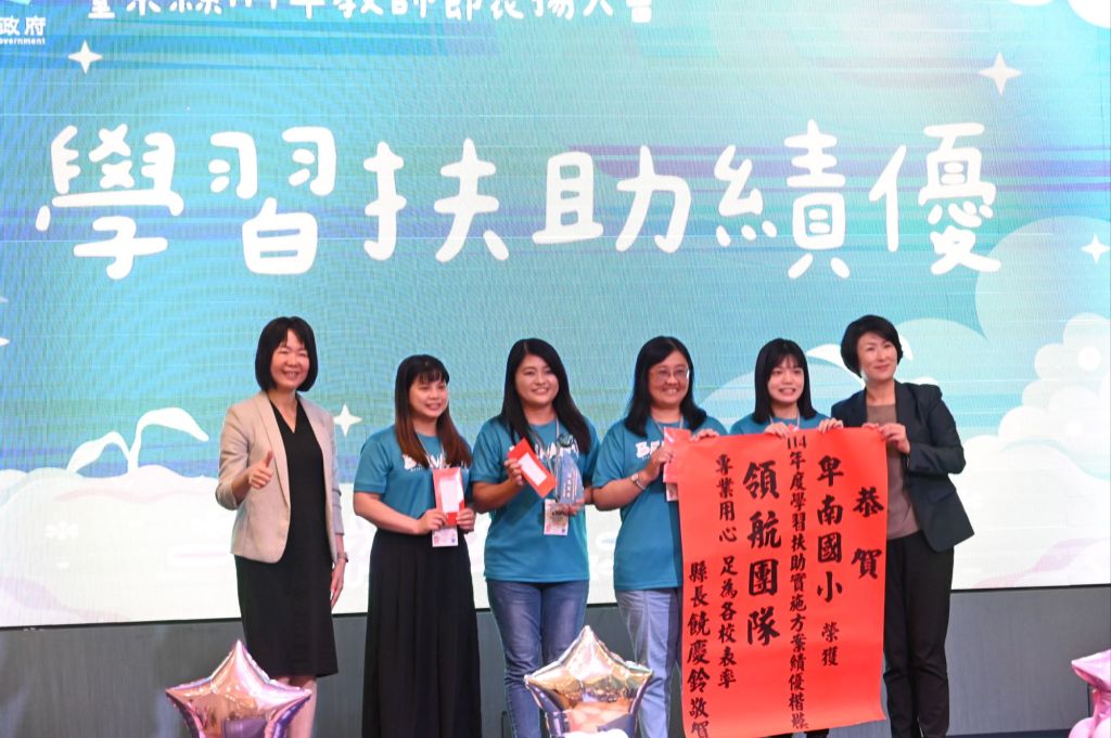 寶桑國中參加國中教育會考,國文科近五年待加強等級學生人數百分比下降超過15%,教學成效顯著,提升學生學力表現優異。獲獎人員有寶桑國中國文科教師黃慧姿老師、謝昀軒老師、王志鵬主任,由游數珠退休校長及楊明政校長率領團隊上臺領獎。此外,學習扶助績優獎亦同步表揚領航團隊獎,有池上國中和卑南國小教師團隊、鐸聲伴學獎則有利嘉國小蘇玉津老師、陳佳淇老師。這些團隊與教師善用多元策略與科技輔助,成功提升學生學習成效,為教育現場注入新動能。