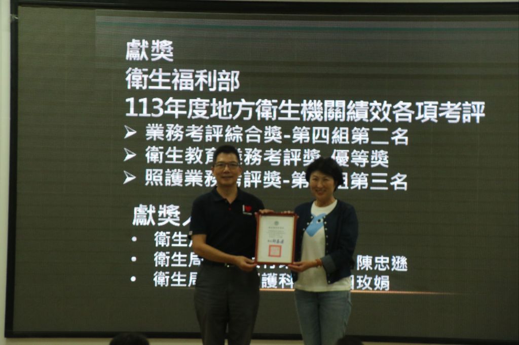 2.衛生教育業務考評獎優等獎(第四組):推動各項健康識能、防疫宣導及正確衛生資訊傳播上的努力。透過創新且多元的衛教方式,有效提升縣民的自我健康管理能力。