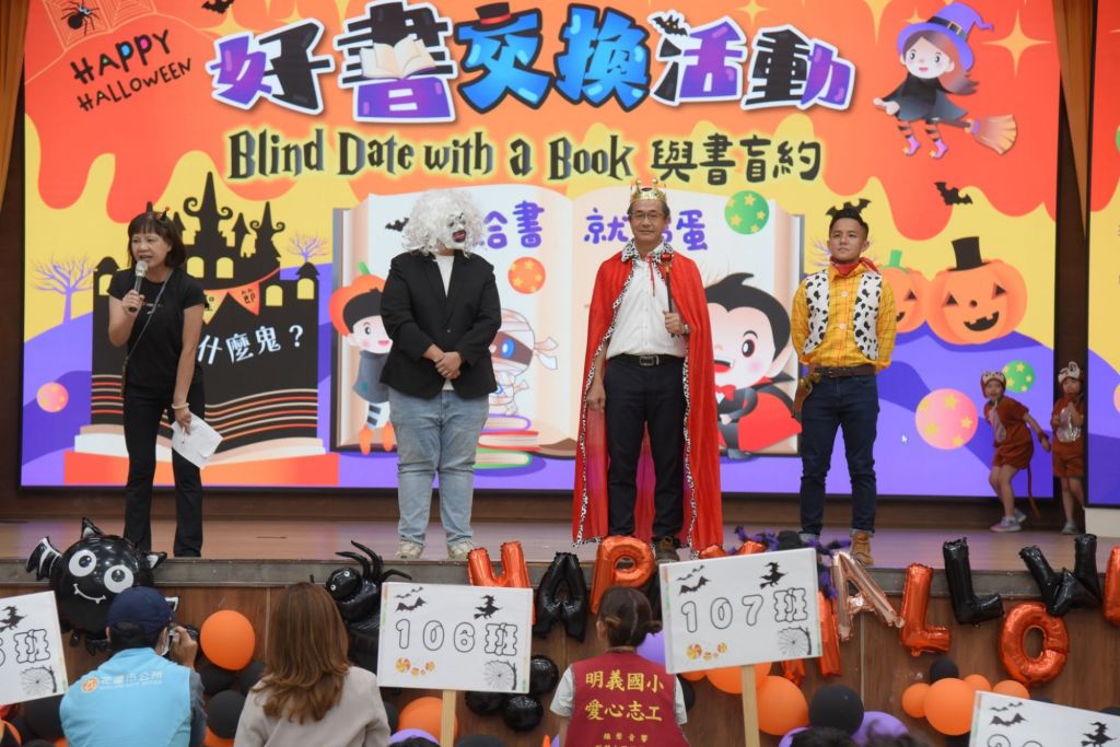 萬聖節將至,花蓮市公所與明義國小攜手舉辦「好書交換活動~Blind Date with a Book與書盲約」,今(23)日校園化身為奇幻書香派對。市長魏嘉彥特地帶著小丑面具登場,明義國小校長許傳德則化身童話故事中的國王,與全校師生同歡,場面熱鬧又溫馨。