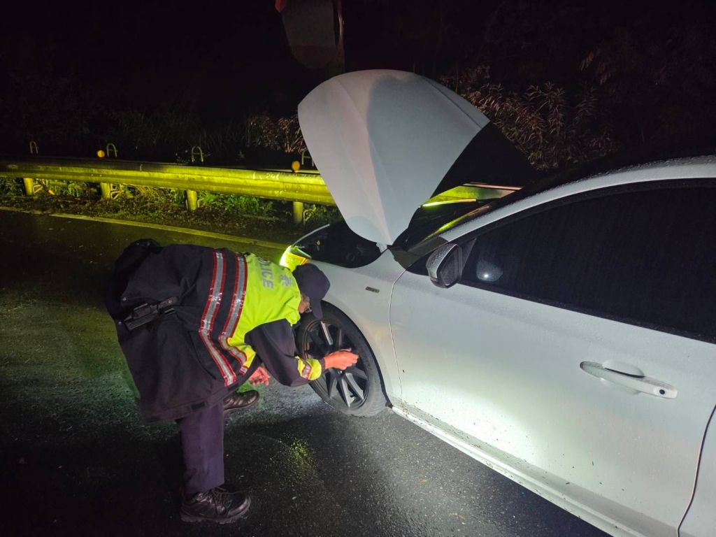 宜蘭縣警察局三星分局南山派出所於日前接獲勤務指揮中心通報,台七甲線36公里處有民眾車輛爆胎受困山區,該所巡佐曾勝三接獲通報後,迅速趕抵現場處置。