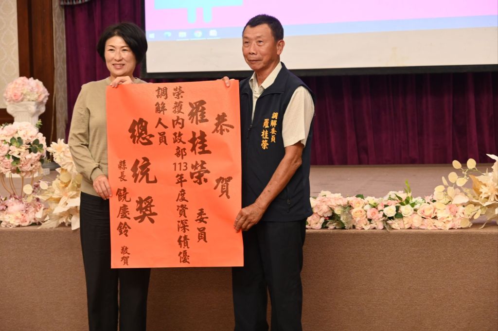 會中縣長饒慶鈴表揚關山鎮羅桂榮、李炳輝服務年資30年,獲頒總統感謝狀,另表揚資深調解委員卑南鄉陳世揚(29年)、卑南鄉廖明利(13年)、卑南鄉印玉蘭(13年)、東河鄉鄭雪禎(18年)、東河鄉(18年)江清霖。而縣警察局交通警察隊警員吳凱豐、李建群、周育如、邱俊傑、葉育岑、董怡伶,蔡雅婷因轉介調解案件超過50件也獲表揚。績優鄉鎮市調解委員會第1名為臺東市、第2名卑南鄉、第3名關山鎮。隨後,豐富多彩的調解業務研習課程接續登場,以提升調解技能並促進委員會之間的聯繫溝通。