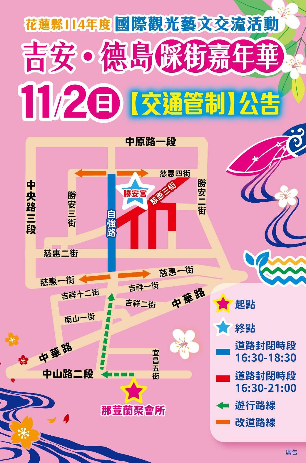 籌劃近一年的「國際城市‧洄瀾風華-吉安、德島暨玉里、卓溪文化嘉年華」,吉安場於昨(2)日晚間在花蓮勝安宮前登場!由日本南大阪連阿波舞團領銜,結合吉安各社區發展協會及在地團體組成踩街隊伍,從那荳蘭部落聚會所出發,沿線兩側人潮多綿延近1公里。有坐著輪椅的阿公阿嬤、爸媽帶著孩子揮手迎賓,遊行隊伍的親友團更高喊「加油!加油!」,現場氣氛如浪翻湧、熱力十足。整場活動吸引逾萬人共襄盛舉。