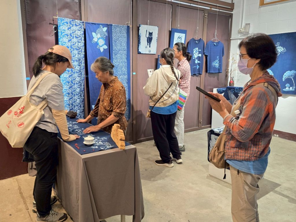 湯老師教導學員型糊染基礎及進階的技法,採用的藍靛及草木灰水,以及棉布、麻布等天然布料,一切都非常環保。湯老師說,這次展出的作品從服飾配件到居家擺飾,風格多元、創意十足。她也預告11月16日上午9點至10點 30分將舉辦親子藍染體驗活動,歡迎民眾親手體驗植物藍染的自然魅力。