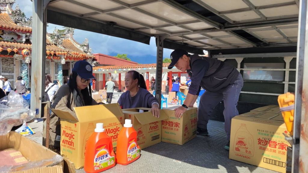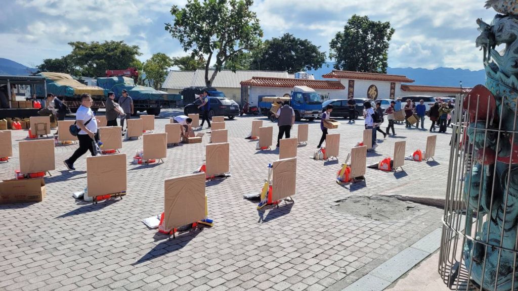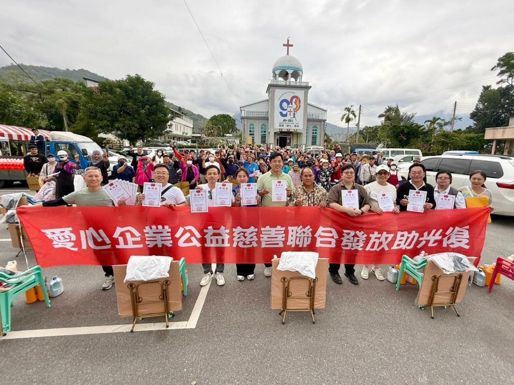 今22日上午10時許,愛心聯合企業善心人士載著100萬元500戶的物資齊聚光復鄉保安宮、天主堂教會、馬太鞍長老教會進行發放。物資捐贈發起人邱婕綺號召許多企業界人士共組愛心聯盟,攜手同心協助村民渡難關。今日每戶可領取摺疊桌一張、兩張椅子、一件防寒防水外套、一瓶洗衣精、一瓶沐浴乳、一瓶洗髮精、拖把一支、洗衣粉、毛帽、襪子、防寒手套、一瓶洗衣精等。