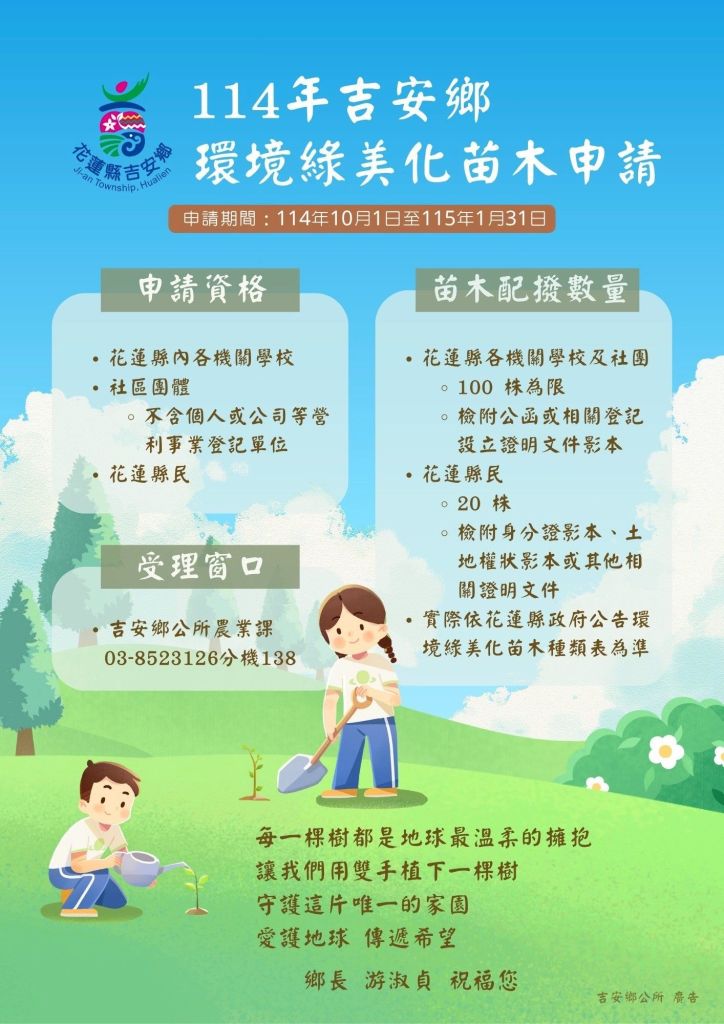 吉安鄉多年來積極推動永續理念,繼「鬱金香公園果樹認養計畫」深受好評後,持續推動環境優化與綠美化行動。為配合花蓮縣政府辦理東部地區造林季節及苗木培育作業,自即日起至115年1月31日止,開放受理「吉安鄉環境綠美化苗木申請」。鄉長游淑貞誠摯邀請各機關學校、社區團體及鄉親朋友踴躍參與,一起植樹護環境,營造更美好的生活空間。