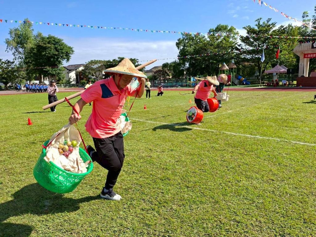 幼兒園與低年級帶來《一二幼!一起衝!》活力操展,展現孩子的自信與滿滿活力。中高年級則由許倍僑教練帶領跆拳道品勢演出,展現力量、速度、攻防與專注力,孩子們整齊劃一的動作贏得全場喝采,充分展現運動家精神。今年特別加入客家文化特色,設計「客家挑擔」與「背穀包」競賽,讓親子共同參與。參賽者挑起象徵傳統生活的擔與穀包奔跑,現場笑聲不斷,也讓孩子在遊戲中自然體會客家文化所代表的勤奮與踏實精神。最受期待的壓軸拔河比賽由豐山國小教職員、行政團隊、東華大學體育系師生與家長委員及志工共同參賽,觀眾加油聲震耳欲聾,象徵教育合作、世代共融與社區支持的力量,使全場情緒達到最高潮。