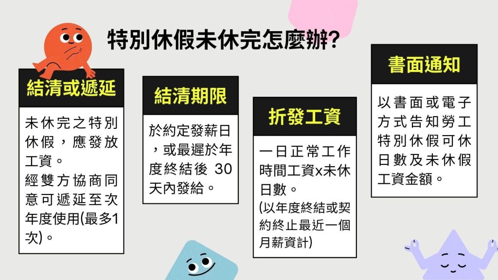 縣府表示,依勞動基準法第38條規定,勞工年度終結或勞動契約終止時,若仍有未休完的特別休假,雇主即應折算工資並依法發給。然而,部分事業單位仍存在誤解,包括認為「自願離職無需折算」、以內規規避給付義務,或逕行將未休特休視為放棄等,均屬違法情形。除年度未休特休經勞雇雙方協商可遞延至下一年度外,其餘屆期或契約終止時的未休天數均須結清,並應於約定發薪日或屆期後30日內發給勞工;若未於期限內發放,恐涉及違法。