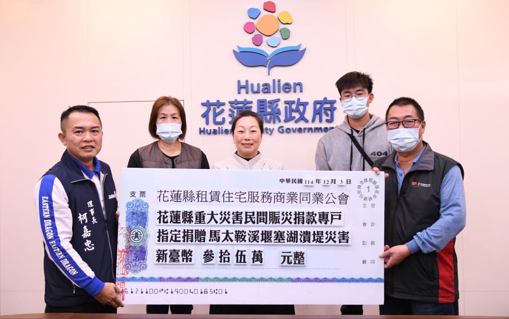 近日花蓮縣光復鄉地區遭逢重大災情,家園受損慘重,縣長徐榛蔚昨(3)日於縣府小簡報室出席花蓮縣租賃住宅服務商業同業公會「救災捐贈儀式」,接獲公會將原訂114年12月1日「授證交接典禮」全數經費捐贈「光復鄉救難基金」,以實際行動關懷災區、回饋社會,展現濃厚地方情懷。