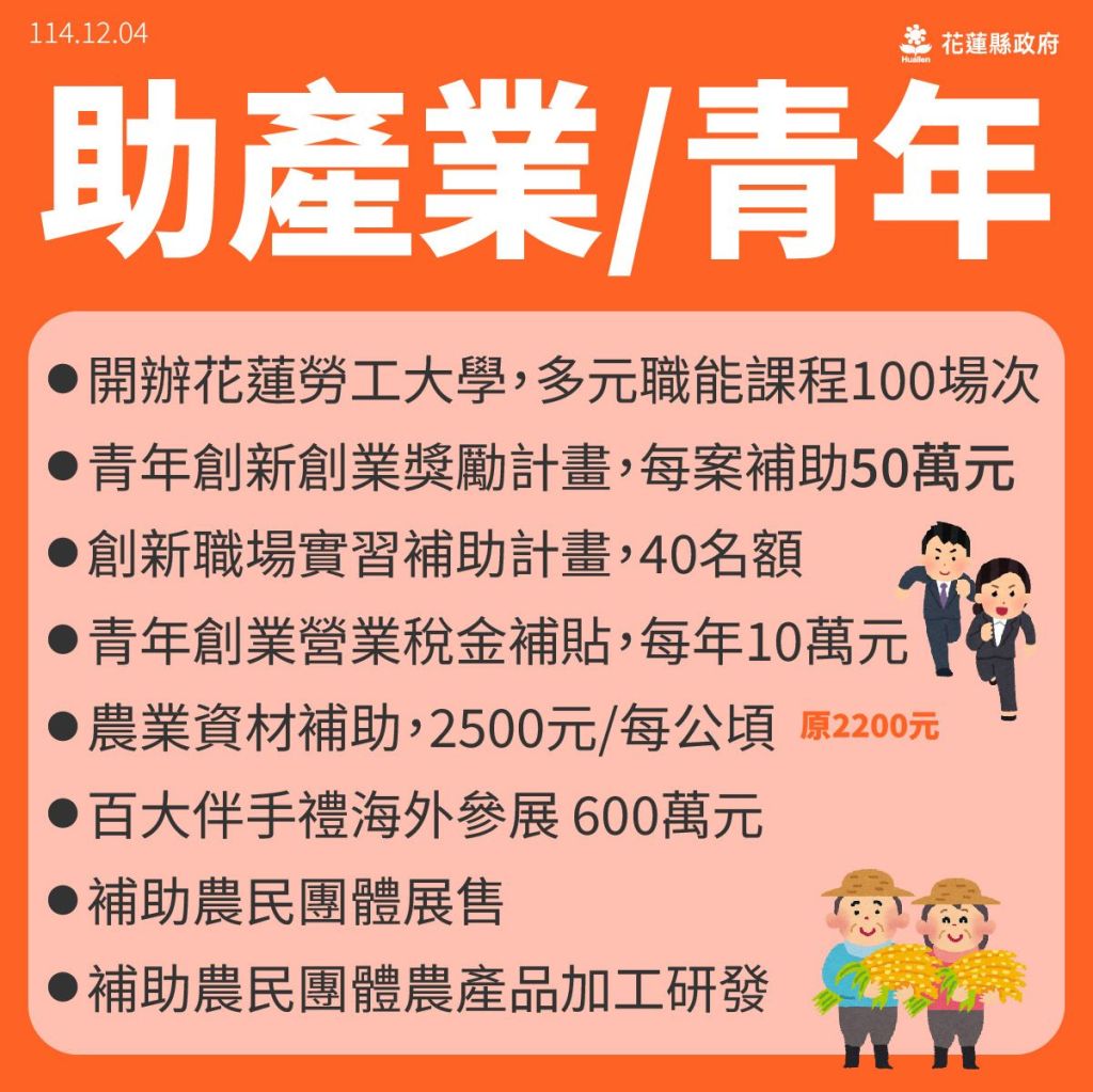 為扶植在地產業與青年發展,青年創新創業補助,預計徵選10案每案最高50萬元,另規劃「創新職場實習計畫」提供40個名額,「青年創業稅金補貼」則每年最高補助10萬元。農業資材補助由每公頃2200元提升至2500元,另提供農民團體展售與農產品加工研發補助,協助拓展市場。編列600萬元補助百大伴手禮海外參展。縣府也將開辦「花蓮勞工大學」,預計舉辦超過100場次職能課程,幫助勞工提升自我。