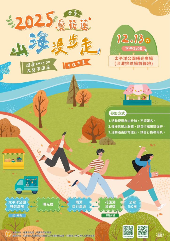 花蓮市公所12月13日星期六下午14時在太平洋北濱公園陽光廣場舉辦「2025冬季愛花蓮.山海漫步走」活動,邀請全家大小、親朋好友一起漫步山海之間,以健康迎接活力的未來。