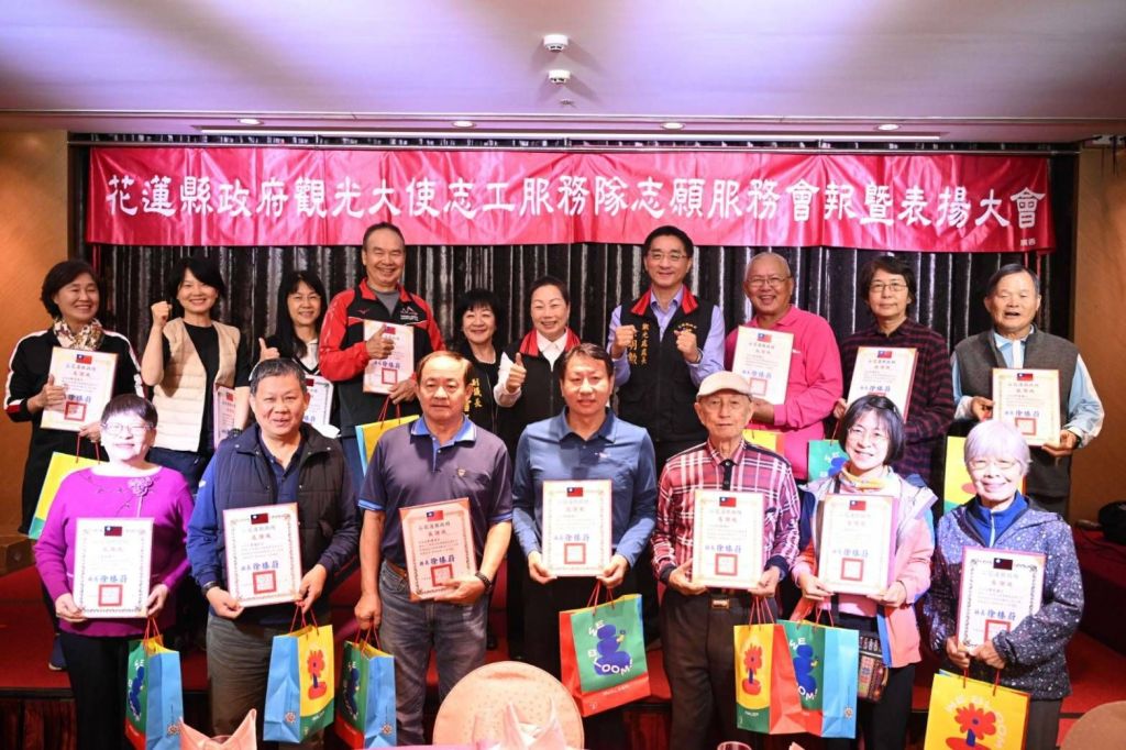 花蓮縣政府為肯定觀光大使志工在114年度各類觀光推廣活動中的奉獻與成果,昨(9)日晚間於煙波大飯店舉辦「114年度花蓮縣觀光大使志工志願服務會報暨績優志工表揚大會」。活動由大隊長徐雪玉副議長、志工隊長紀有亭帶領志工團隊齊聚一堂,縣長徐榛蔚親臨現場頒發獎項,表揚16位幹部及25位服務時數績優志工,感謝志工的付出,為花蓮觀光投注暖心的力量。