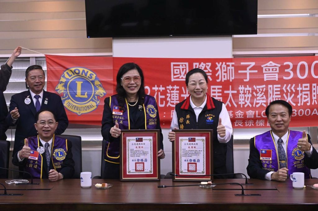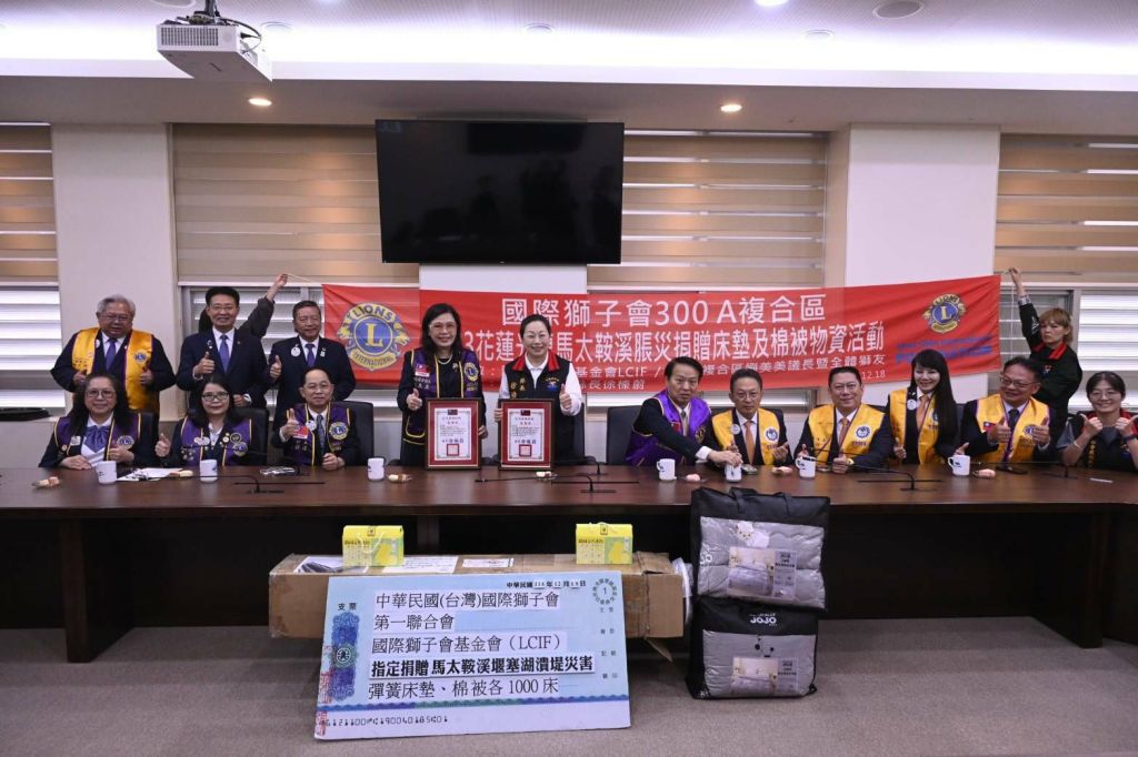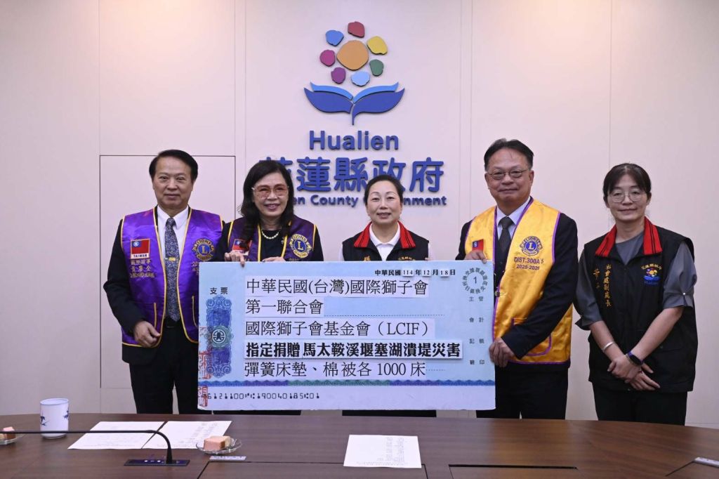 中華民國(台灣)國際獅子會第一聯合會及國際獅子會基金會(LCIF)今(18)日由300A複合區總監議會議長劉美美率領代表團拜會花蓮縣政府,捐贈光復鄉災區1000床彈簧床墊、1000床棉被,由縣長徐榛蔚代表受贈,希望藉此善舉拋磚引玉,邀請各界共同為災後重建的漫漫長路盡一份心,徐縣長頒發感謝狀,並代表花蓮鄉親至上最深的感謝。